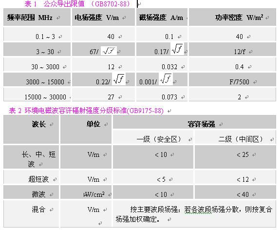 在對一般環境的電磁輻射分析中,應主要選用《環境電磁波衛生標準》主要選用《環境電磁波衛生標準》(GB9175-88),根據輻射源的主要輻射頻率,參照表2,找到其輻射強度限值。注意掌握三個標準限值,一般我們把居民居住的環境按一級安全區處理,則其標準限值為:在長、中、短波,電場強度應小于10V/m;在超短波段,電場強度應小于5V/m;在微波波段,其輻射功率密度應小于10μW/cm2。考慮到對在電磁輻射環境內工作人員的保護,我們建議在職業安全衛生領域,采用《電磁輻射防護規定》(GB8702-88)的相應限值。